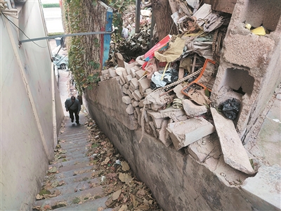 记者在现场看到,这条石阶路建在黑龙江中路777号楼和北面山墙之间,通行宽度不足1.5米,落差约8米,楼梯口处用红漆写有“危墙”字样。墙体上有数不清的裂缝,最长的一条裂缝几乎自上而下贯穿了整面山墙。记者注意到,这面山墙已经向楼梯内侧倾斜,而山墙另一侧长着几棵大树,树下堆放着不少杂物,给山墙造成了不小的负担。