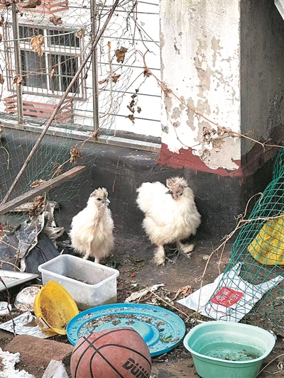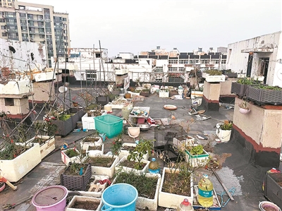 近日,记者在利津路27号1号楼3单元楼顶看到,种菜、养鸡、堆放杂物的区域面积大约70平方米。种植蔬菜的各类箱子超过20个。在天台北侧养了两只鸡,喂水、喂食的盆子随意摆放,地上尽是散落的泥土。平台上还堆放着破沙发、烂椅子、锅碗瓢盆等生活杂物。由于堆放杂物的区域紧邻天台入口,这样的乱象让不少居民反感。“天台上种菜、养鸡已有一年多时间,堆放的物品越来越多,异味特别大。”一位住在3单元的业主说。