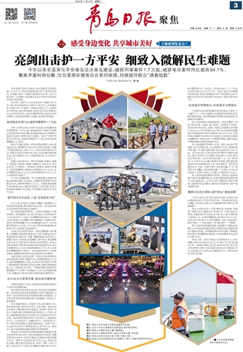 ~~~今年以来全面深化平安青岛法治青岛建设,破获刑事案件1.7万起,破获电诈案件同比提高64.1%;聚焦矛盾纠纷化解、优化营商环境等出台系列举措,持续提升群众“满意指数”