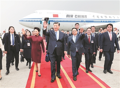 河内内排国际机场,400多名中越各界代表手持两党两国旗帜翘首以盼,“热烈欢迎习近平总书记、国家主席和夫人访问越南!”的红色横幅格外鲜艳夺目。
