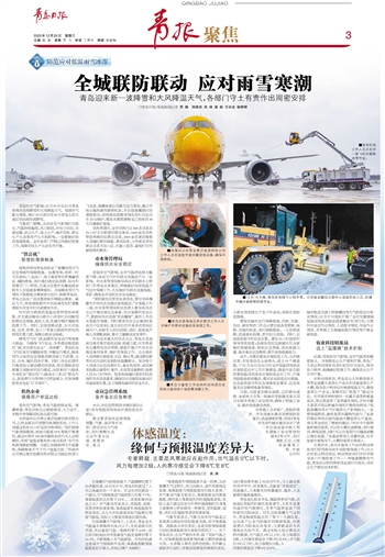 青岛地处胶东半岛,属温带季风气候,沿海地区受海洋环境的直接调节,又具有显著的海洋性气候特征,冬季气温明显高于同纬度的内陆地区。但在这轮寒潮天气过程中,青岛极端低温达到了零下十几摄氏度,远远高于山东内陆城市的极端低温,但感觉要比内陆地区冷很多,主要就是因为风寒效应在起作用。通过实验大致计算出这样的数据:当气温在0℃以上时,风力每增加2级,人的寒冷感觉会下降3℃至5℃;当气温在0℃以下时,风力每增加2级,人的寒冷感觉会下降6℃至8℃。
