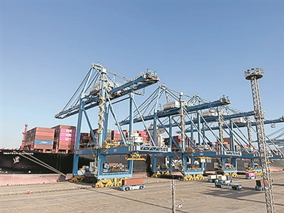 ~~~满载山东货物的“乌奈札快航”驶离青岛港前湾港区集装箱自动化码头