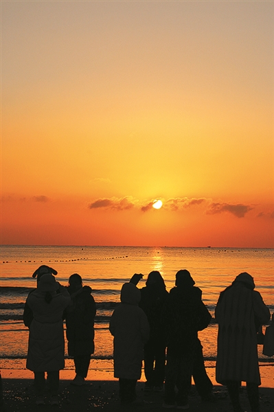 1月1日早,在青岛金沙滩海水浴场,人们在新年的第一缕阳光中,迎接2024年的到来。梁 超 摄