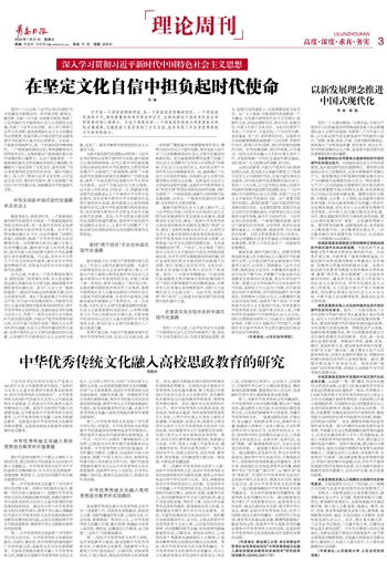 习近平总书记在庆祝中国共产党成立100周年大会上的重要讲话中指出,“坚持把马克思主义基本原理同中国具体实际相结合、同中华优秀传统文化相结合”。中华优秀传统文化的时代价值在马克思主义中国化进程中日益彰显,已经成为中华民族伟大复兴的精神动力之源。高校作为培育时代新人的重要场域,应不断汲取中华优秀传统文化的营养,让中华优秀传统文化融入高校思想政治教育。这既是加强中华优秀传统文化教育的现实需要,也是推动高校思政教育创新发展的迫切需求。