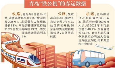 国铁济南局青岛站预计,今年春运的整体客流稳定增长,以探亲流、学生流为主,务工流、旅游流为辅,呈现出节前平稳、节后明显增长的特点。客流主要以省内及京津、江浙沪、河南、河北、东北等方向为主,新线产品提升青岛去往郑州及西南、西北等方向开行品质,直通客流需求将增加。春运期间,青岛站(含青岛北站、济青高铁各车站)预计发送旅客290万人,发送量与去年相比增长63%。车站科学安排春运方案,梯次投放运力,安排临客运行线31对(含图定高峰线13对),恢复淡季停运旅客列车1对,有效保证运力供给。