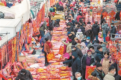 1月27日,腊月里的青岛李村大集恰逢周末,春联、福字、糖果、糕点琳琅满目,吸引了众多市民前来置办年货。