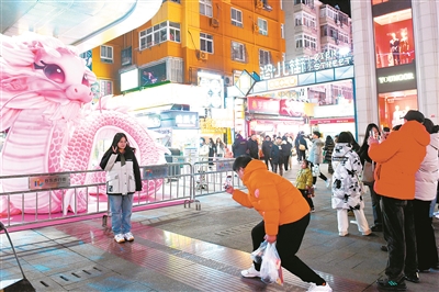 入选第三批“全国示范步行街”的台东步行街,设置了“你好2024”新春主题景观,灯笼、大鼓、烟花等造型元素提靓了街区的新春“颜值”。天桥之下,一条动感十足、造型可爱的粉色“蛟龙”亮相街头,吸引了不少市民游客“打卡”留影。与此同时,人气最旺的恣儿街也布置一新,一串串景观灯带营造出金色天幕,美食飘香,游客熙攘,恣儿街的人气持续高涨。