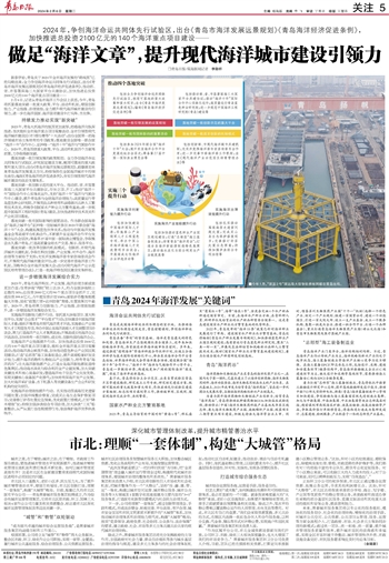 2024年,争创海洋命运共同体先行试验区,出台《青岛市海洋发展远景规划》《青岛海洋经济促进条例》,加快推进总投资2100亿元的140个海洋重点项目建设——~~~