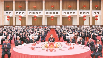 人民大会堂宴会厅灯光璀璨、喜气洋洋,各界人士齐聚一堂、共迎新春,现场洋溢着欢乐祥和的节日气氛。