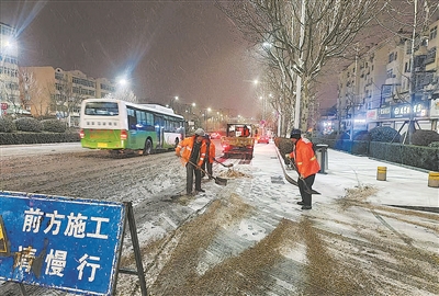 青岛城运控股集团所属各公交突击队凌晨出击、迅速行动,突击队员们迎着风雪,手拿铁锹和扫把分赴易发生冰冻路滑地段,对线路途经坡道、转弯等地点铺撒融雪剂并开展除雪作业,为市民安全出行铺就“暖心路”。