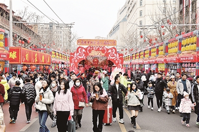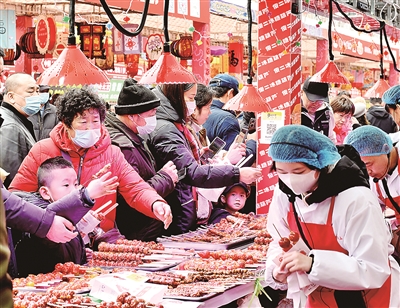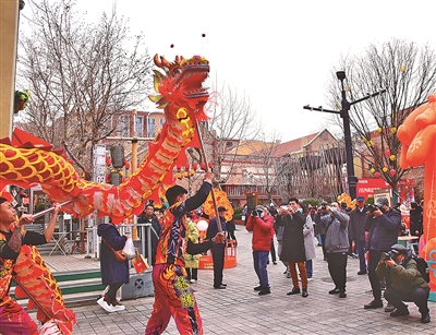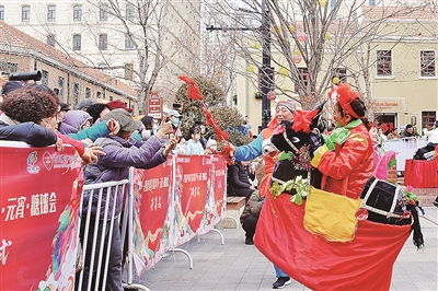 今年的节会早在正月初四就开始预热。2月13日,在大鲍岛文化休闲街区的博山路广场上,伴随着一阵高亢嘹亮的锣鼓声,“烟火气 国潮风 市北情”大鲍岛新春市集开市。琳琅满目的商品一齐上架,锣鼓、舞龙、舞狮等精彩表演将街区的欢乐氛围数次推向高潮。白天,市民和游客可以逛市集、尝美食、看表演,晚上可以赏花灯、观看沉浸式光影秀等。