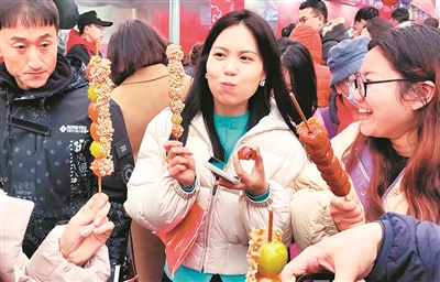 这年味绽放于味蕾。有道是“人间烟火气,最抚凡人心”,大鲍岛新春市集上,火红的糖球是当仁不让的主角,其“红红火火,吉祥如意”的象征从500余年前延续至今,各色小吃琳琅满目,令人垂涎;台东步行街、中山路老街烟火气蒸腾,人潮的喧嚣夹杂着叫卖声,幻化为城市跳动的音符。
