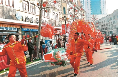 这年味尽显文化之丰美。大鲍岛人潮涌动,阔别四年的萝卜元宵糖球会在震天锣鼓、游龙踩街中焕新回归,萝卜雕刻、糖球制作大赛等品牌赛事和舞龙舞狮、秧歌、即墨柳腔、莱西木偶等民俗“传统项目”纷纷亮相,唤醒老青岛人魂牵梦萦的独特年味。游逛花灯节、青岛天后宫民俗文化庙会,市民游客与京剧表演、山东快板等不期而遇,在非遗民俗展演中体味传统年俗,领略艺术魅力。