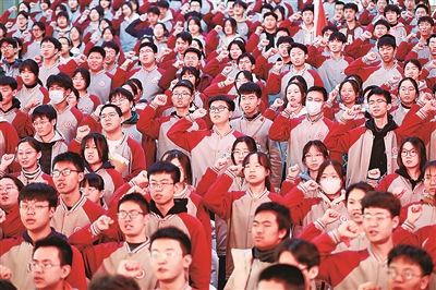 青岛三中举行“十八而志,决战百日”百日誓师冲刺动员大会暨学生成人礼,学生在家长、老师的祝福中,宣誓、签名,走上红毯,跨过成功门,努力奔赴成功的彼岸。青岛实验高中校长石华军为高三学生代表颁发旗帜并讲话,全体学生喊出响亮的口号。此前,青岛二中、青岛十六中等学校也都启动了高考百日冲刺活动。 王世锋