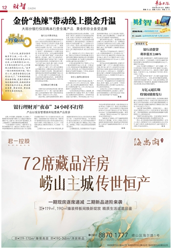 “总体来看黄金价格呈上涨趋势,建议选择我行的‘如意金’积存,客户可根据自己的需求选择克重积存,一次性积存或是每月定存都行。积存的黄金,客户可以选择提取实物金,也可以放在账户投资,等价格上涨后卖出赚差额。”工商银行青岛台东支行高级客户经理周翔说。