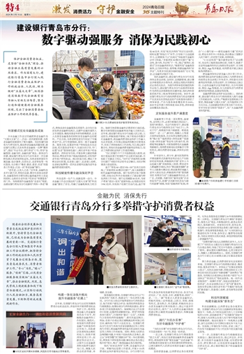 随着社会经济发展和消费者自我权益保护意识的不断提升,坚持常态化金融消保,已经成为金融高质量发展的重要一环。交通银行青岛分行深入贯彻落实中央金融工作会议精神,把坚持金融工作的政治性和人民性贯穿于发展全过程各方面,聚焦青岛政务民生、消费者保护工作,“专心”为民,“暖心”服务,“创新”引路,以优质金融服务做实做细“五篇大文章”,推出金融便民、利民、惠民等线上便捷服务和线下场景体验模式,以实际行动践行人民金融担当,服务高质量发展,不断取得新成效展现新作为。