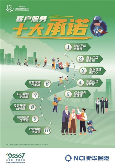 新华保险积极贯彻落实监管部门要求,牢固树立以人民为中心的价值取向,进一步做好消费者权益保护和金融教育宣传工作,在“3·15”期间全新发布2024年客户服务十大承诺,并在全系统范围内开展承诺践诺活动,让诚实守信成为全体员工的自觉遵循,共同营造和谐健康的金融消费环境,为金融业高质量发展贡献力量。