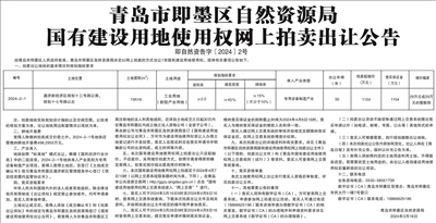 青岛市即墨区自然资源局国有建设用地使用权网上拍卖出让公告