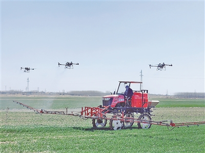 “现在正是小麦返青期,碾压可以促进根部发育,增强小麦抗倒伏能力。”在杨家庄村的麦田里,青岛市农技中心高级农艺师孙旭亮对农户面对面介绍小麦“三改三提”单产提升技术,通过改良土壤培肥地力、改进农机作业质量等措施,实现小麦产量提升。“今年返青施肥有了‘神器’。”在杨家庙村的麦田里,无人机操作手朱梅楠正在执行“飞防”任务。他介绍,这1000多亩地只需3天就能施一遍肥,平均1亩地施肥成本不到20元,比传统方式大幅节省了成本。与此同时,他的“同行”、植保无人机手于兹梁则现场演示了大疆新款植保无人机T60。