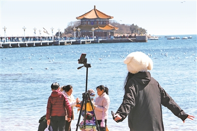 ■3月19日,午后的青岛阳光明媚。迎着海风,漫步栈桥能感受到海滨之城的独有浪漫。海鸥翔集、人鸥共舞的美丽场景成为许多主播的“直播间”,通过镜头,直播间里的观众实现“居家”逛青岛,这也将吸引更多的游客来青岛游玩。 梁 超 摄影报道