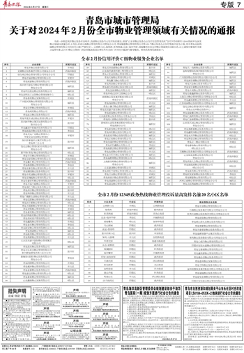 为进一步规范我市物业服务市场秩序,推进物业服务行业信用体系建设,根据“山东省物业服务企业信用信息管理系统”信用评价结果和12345热线平台涉及物业领域诉求量分析,2月份,河南正商物业管理有限公司青岛分公司、青岛颐惠物业管理有限公司等123个物业服务企业信用等级评定为C级,其中青岛众拓锦城物业管理有限公司为信用C级(严重失信)。云南路小区、海棠湾、世茂锦域、远东·海岸华府、丽海馨苑位居全市物业领域类投诉前五名,以上通报对象被列为重点监管对象,区(市)物业主管部门将会同属地街道办事处和有关部门对存在问题进行督导整改。现将具体情况通报如下:
