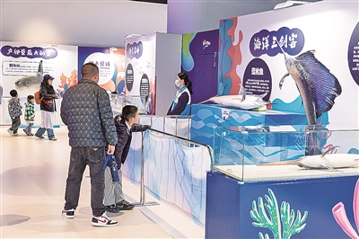 “宝贝,这是短距离游泳速度最快的鱼类,一小时最快能游113千米,就和咱开车跑高速速度差不多!”市民张女士指着旗鱼标本,对照着旁边的科普文字给孩子介绍着,“你看,这种鱼的背上长了高高的鱼鳍,上面有黑色的斑点,既像风帆,又像旗帜,因此人们称它为旗鱼……”伴随着介绍,孩子目不转睛地看着栩栩如生的海洋标本,并时不时发出疑问,充满了好奇心和求知欲。