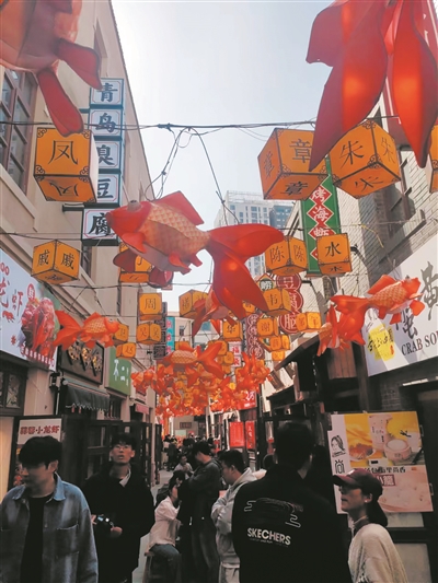 在大鲍岛文化休闲街区,海泊路上的“大焕异彩 步步生花”非遗剪纸系列美陈、“千灯映鲍岛”灯笼氛围已经就位。“目前,街区南片整体氛围营造已经初现成效,我们将加大力气丰富北片展陈。比如,联合街区店铺布置国潮风系列的灯箱侧招,在即墨路重要节点设置青年新潮主题的网红打卡美陈,并利用暂未落位业态的院落打造‘植物想象力’等主题展陈,提升历史城区人气和商气。”张洋介绍。