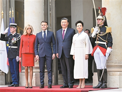 五月的巴黎,风和景明。塞纳河畔,荣军院金色穹顶熠熠生辉,五星红旗和蓝白红三色旗迎风飘扬。
