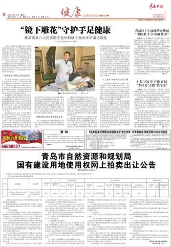 近年来,青岛市第八人民医院手足外科实现跨越式发展,断肢再植成功率达90%,游离皮瓣及拇指再造成功率达98%以上,两项核心技术均达到国内领先水平,科室先后成为青岛市手足外科中心和市医学会手外科学专科分会主委单位。