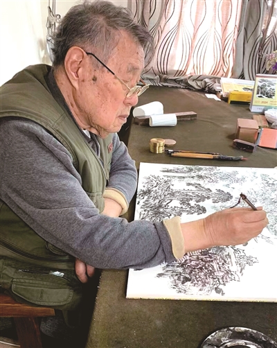 90岁高龄的刘文泉,依然精神矍铄,自信满满,每天作画治印,乐此不疲,他的书房展板上可以看到多幅近期创作的得意之作。他用中国传统水墨画来表现写意山水,早年足迹遍寻的名山大川和大好河山早已化作胸中丘壑,随时纵笔即自成一番山水气象。
