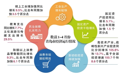 5月23日上午,市统计局发布今年1-4月份青岛市经济运行情况。今年以来,全市上下积极应对经济下行压力,加大宏观政策实施力度,生产需求平稳增长,就业物价总体向好,全市高质量发展扎实推进,经济运行总体平稳。