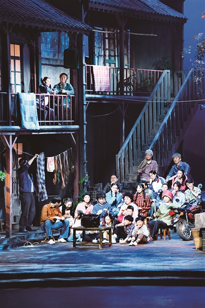 同属于“青岛市文艺精品扶持项目”的《烟火人间》,讲述了一座老里院里悲欢离合的人间故事。该剧在桂林演出后获得了当地媒体高度评价,“全剧以杨老十和胡文进这对欢喜冤家的情感延展为主要情节线,几户人家的生活齐头并进地展开——杨家勤劳守望,胡家廉政正直,刘老师执着等待,秦师傅孤身烟火,青岛大姨爱话家常……使用群像式展览结构,展现了一幅朴实温情的邻里生活图鉴。”与《弄潮》相似的是,主角“杨老十”也是一位青岛港口劳模,他下班后不忘苦练桥吊技术的细节、邻里之间的青岛方言交流,非常有里院味道。为什么这样一部青岛感十足的戏,能打动千里之外的广西观众?
