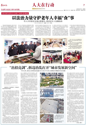精准监督破解老年人助餐难点堵点。“目前助餐服务受益面比较窄,很多行动不便的老年人没能享受到助餐服务,如何解决‘送餐难’的问题,如何扩大服务覆盖面?”青岛市十七届人大常委会第十三次会议对实施爱老助老五项行动的议案办理情况开展专题询问,议案领衔人、市人大代表李存业一针见血、直指问题。市政府有关部门现场答询,并拿出务实举措。2023年底,市民政局联合中国银联青岛分公司,在“云闪付”App上开发了“代订餐”亲情服务。通过这项服务,亲属可在线上为老人订餐送餐,并享受市、区(市)两级助餐和送餐补贴。今年4月30日,市政府办公厅出台《关于积极发展老年助餐服务的实施意见》,提出通过“发挥外卖平台、物流企业等作用”“鼓励街道(镇)、社区(村)开设养老服务类社会公益性岗位”“整合社会工作者、社区社会组织、社区志愿者、社区公益慈善组织等资源”等多元方式补齐“送餐难”这一短板。“老母亲年纪大了,自己在家做不了饭,我还要带孙子,真是顾不过来,社区能给老人送餐上门,真是解决了我们的难事。”李沧区沧口街道永青苑社区居民崔贵珍说。