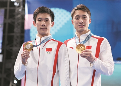 7月29日,在巴黎奥运会跳水男子双人十米台决赛中,中国选手练俊杰/杨昊夺得金牌。这枚金牌是山东小伙练俊杰为我省夺得的本届奥运会首枚金牌。图为练俊杰(右)/杨昊展示金牌。