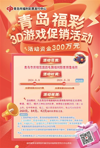 8月7日,青岛市福利彩票发行中心发布“青岛福彩3D游戏促销活动”公告。自8月8日起(3D游戏2024211期)至8月31日(3D游戏2024234期),在青岛市所辖范围的电脑福利彩票销售场所,开展为期24天的福彩3D游戏促销活动,活动资金300万元,收尾资金28万元。