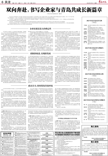 当选2023年度青岛经济人物、经济新锐人物以及提名的企业家就用一个个生动的案例展示了企业家之于青岛这座城市的意义。正是他们凭借企业家独有的视野、眼光和魄力,不惧风浪,勇毅前行,才为青岛经济乘风破浪发展吃下了“定心丸”。