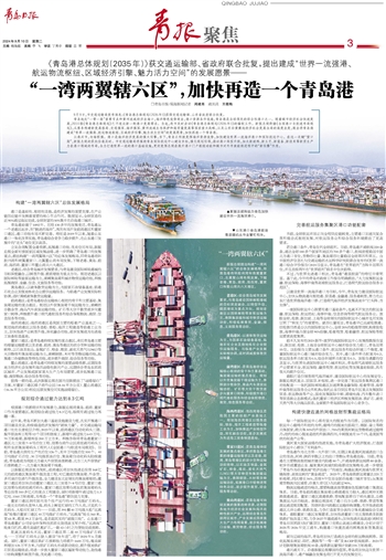 新版总规提出构建“一湾两翼辖六区”的总体发展格局,即青岛港将环胶州湾和南翼董家口、北翼鳌山湾布局发展,下辖老港、黄岛、前湾、海西湾、董家口和鳌山湾共六大港区。