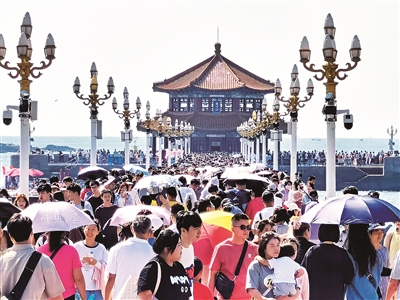 中秋假期,青岛的文旅街区、景区等纷纷策划推出缤纷多彩的活动,一系列新场景、新业态、新体验,让市民游客沉浸式感受佳节魅力,带动青岛文旅热度持续攀升。携程数据显示,今年中秋假期,青岛上榜国内十大热门旅游目的地城市。图为栈桥上人流如潮。 王雷 摄