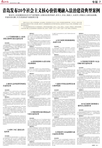 ~~~青岛市人民检察院发布的10个典型案例,主要涉及英烈保护,老年人、妇女、残疾人、未成年人等重点人群权益保障,矛盾纠纷化解,生态资源保护与修复等方面