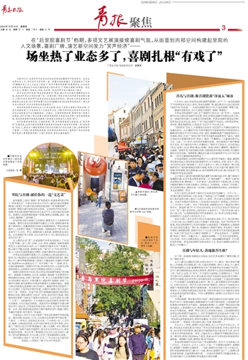本地观众小李在9月28日观看了青岛里院喜剧节的两场演出。演出间隙,他走进三江里,与充满文艺风情的青年街区撞了个满怀。小李表示,里院街区原本是一个由特色小吃、人文书店、淘碟小店构成的场景,10多年前非常受文艺青年喜爱,如今输入了新的业态后可谓“腾笼换鸟”,爵士乐酒吧、书店、剧场等一应俱全,“如果不是因为喜剧节,我不会在这里待这么久,感受新里院的质感。我不光看了新喜剧,还在古巴文化交流中心感受了萨尔萨舞体验课,在中山路上听到了现场版铜管五重奏,一首《龙猫》让我这个‘老文青’泪目了。”在文化生态丰富的里院街区,小李找到了属于自己的“特色菜”。