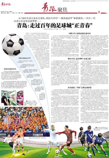 近年来,职业足球开创“一城双超双甲”的崭新格局,青岛成功入选“十四五”期间全国首批9个足球发展重点城市,青岛城市足球联赛入围国家体育总局首批群众“三大球”精品赛事,青岛市足球协会荣获国家体育总局“全国群众体育先进单位”称号,青岛市社会青训机构已达55家,向各级国家队输送人才达到30余人,群众足球、青少年足球根基深厚、氛围火热……从1924到2024,青岛足球运动发展百年征程星光璀璨。