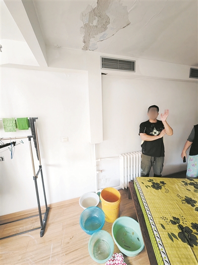 14日下午,雨刚停,记者赶到杨先生位于7楼的家中,只见南卧室天花板和墙面上挂着水珠,约1平方米的墙皮掉落在地板上,卧室里摆着大大小小的盆和桶用于接雨水,屋内一片狼藉。