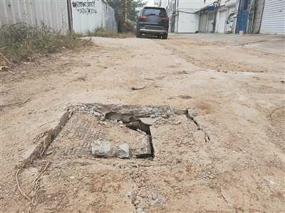 记者在现场看到,小区北侧道路受损情况最为严重,近百米的水泥路面被轧得粉碎,一个方形井盖已碎裂,两个圆形井盖的四周塌陷。