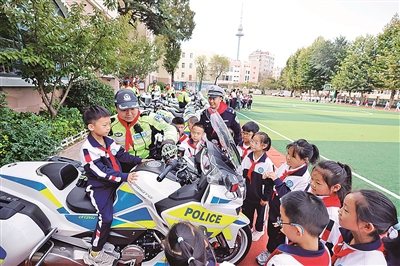 ■日前,一场别开生面的“铁骑进校园 安全伴我行”活动在青岛上清路小学举办,青岛交警支队特勤大队铁骑队队员给小学生们详尽讲解安全过马路、一盔一带、常见交通标识等交通常识;以及闯红灯、逆向行驶带来的危害,引导孩子们自觉遵守交通法规,安全文明出行。 万云军 摄