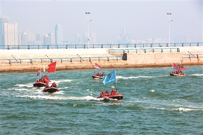 本报10月24日讯 24日上午,2024全国首届水域救援综合技能公开赛暨高精尖水域救援装备展演活动在青开幕,来自全国的20支专业救援队伍围绕水域搜救、潜水救援、船艇驾驶等多个项目展开激烈角逐,充分展示专业技能和团队协作精神。活动将持续至26日,同期举办青岛国际安全应急暨水域救援装备产业博览会、2024水域应急技术创新交流会、征集年度水域特色案例等活动。