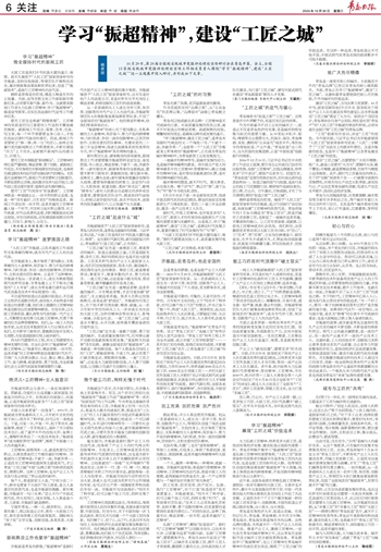 建设“工匠之城”,还需要致广大而尽精微。致广大,就是心里要有“大方向”,要胸怀大局、敢于攀登;尽精微,就是要精益求精,在细节与精度上追求极致。此外,新时代工匠最突出的特点,在于把“创新”刻进骨子里——打破墨守成规的思维惯性,对现有的生产技艺大胆革新,进而给行业、产业技艺带来突破性贡献,促进生产技艺水平提升,推动社会经济发展。