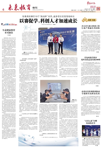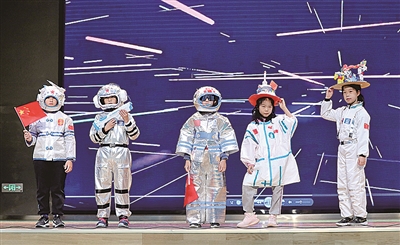 ■日前,青岛镇江路小学举行了以“科技点亮童心,梦想启迪未来”为主题的校园科技节活动。在科技T台走秀环节,学生们穿上自己动手制作的科技主题服装,踏着音乐闪亮登场,从“梦幻太空”到“海底世界”,从智能机器人到绿色环保,学生们展现出对未来世界的勇敢探索。 韩 星