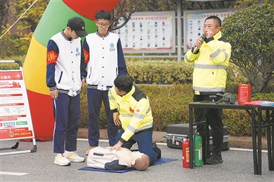 崂山区张村河小学师生疏散到安全地点后,区卫健局派出的医疗救护分队迅速展开救援行动,对模拟受伤学生进行现场包扎等应急救治,同时还为师生详细演示创伤急救方法,耐心讲解急救知识要点,以实际行动为师生们上了一堂生动的自救互救课。
