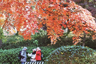 走进中山公园枫林涧,满树的枫叶层层叠叠,黄色、橘色、红色……色彩斑斓,极具观赏性。“感觉今年枫叶观赏期变长了,现在已12月上旬,满树的枫叶还这么绚丽,这可能和天气暖和有关。”一位正在拍摄红叶的市民说。