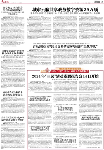 构建“1+8+10+20+N”工作推进体系,发布2035年海洋发展远景规划。在全省率先启动海洋经济立法。组建青岛海洋发展集团。崂山实验室科研攻关取得积极进展,青岛蓝色种业研究院挂牌成立,“深海三大国家平台”签署部省市共建协议,全市涉海省部级以上创新平台达到143家。明确“4+2+4”产业发展方向,因地制宜培育海洋新质生产力。亚洲首艘圆筒型海上油气加工厂“海葵一号”正式交付。